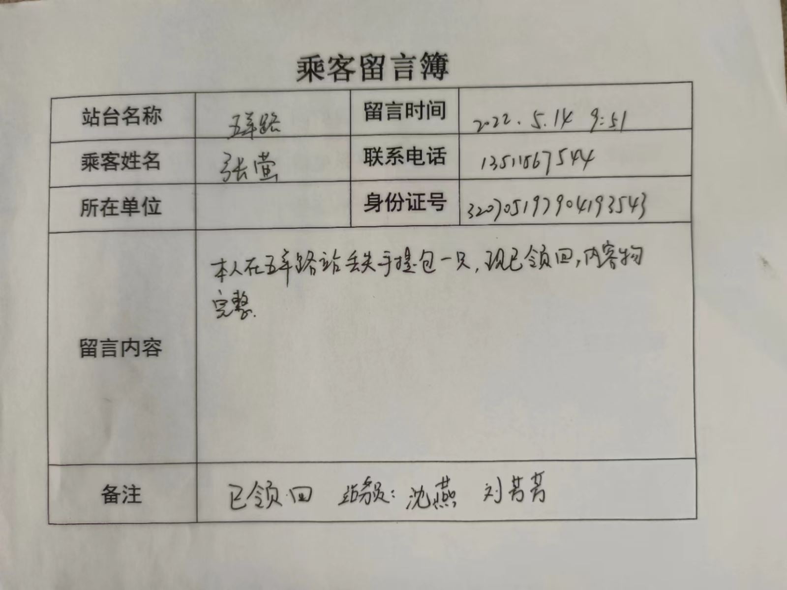 5月4日上午,新光路站當班站務員劉芳芳正在查驗乘客“雙碼”及測量體溫。就聽見有人在喊:“站務員,站務員!”劉芳芳便往喊聲處望去,只見一位乘客從B1車上下來邊跑邊喊,劉芳芳見狀急忙迎了上去并詢問發生了什么事情:原來是乘客上車太匆忙,車輛出站后發現自己的包丟在了五羊路站臺。在問清丟失包的特征及丟失位置后,劉芳芳立即返回票房聯系五羊路站站務員。在等待回復的時間,劉芳芳安撫乘客著急的心情,幾分鐘后,得到五羊路站站務員的回復說:“包找到了,讓乘客盡快來領取。”劉芳芳將這一消息告訴乘客,乘客連連表示非常感謝。又過了一會,五羊路站務員告知劉芳芳,失物乘客已領回并留下感謝信。