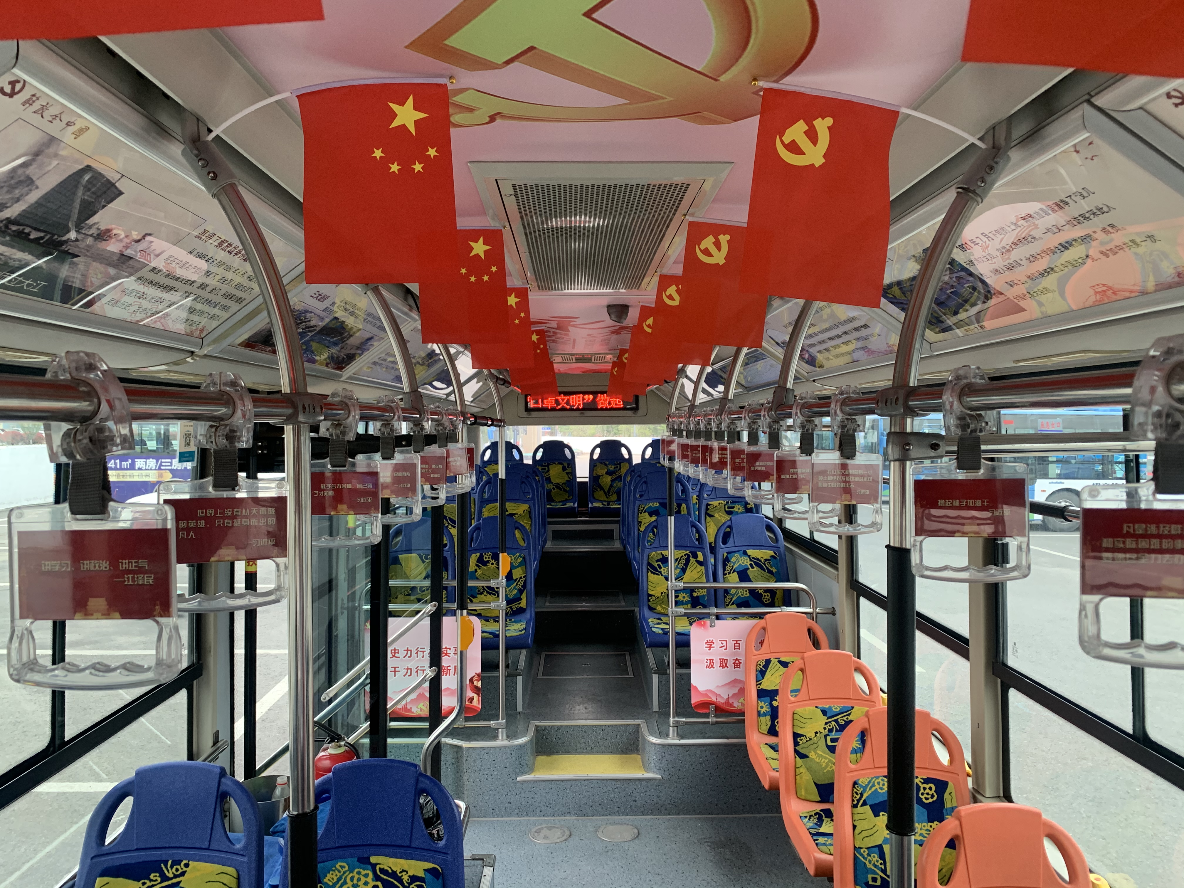 車廂里,踏上主題車,映入眼簾的是那一抹艷麗的中國紅,將“紅色文化”氛圍感拉滿。車廂內頂紅色國旗掛滿兩側,車內看板上通過圖文并茂的形式生動形象再現黨的光輝歷程,拉手上投放黨的歷屆偉人金句振奮人心,整個車廂熱情而莊重,形成了一道靚麗的風景線。