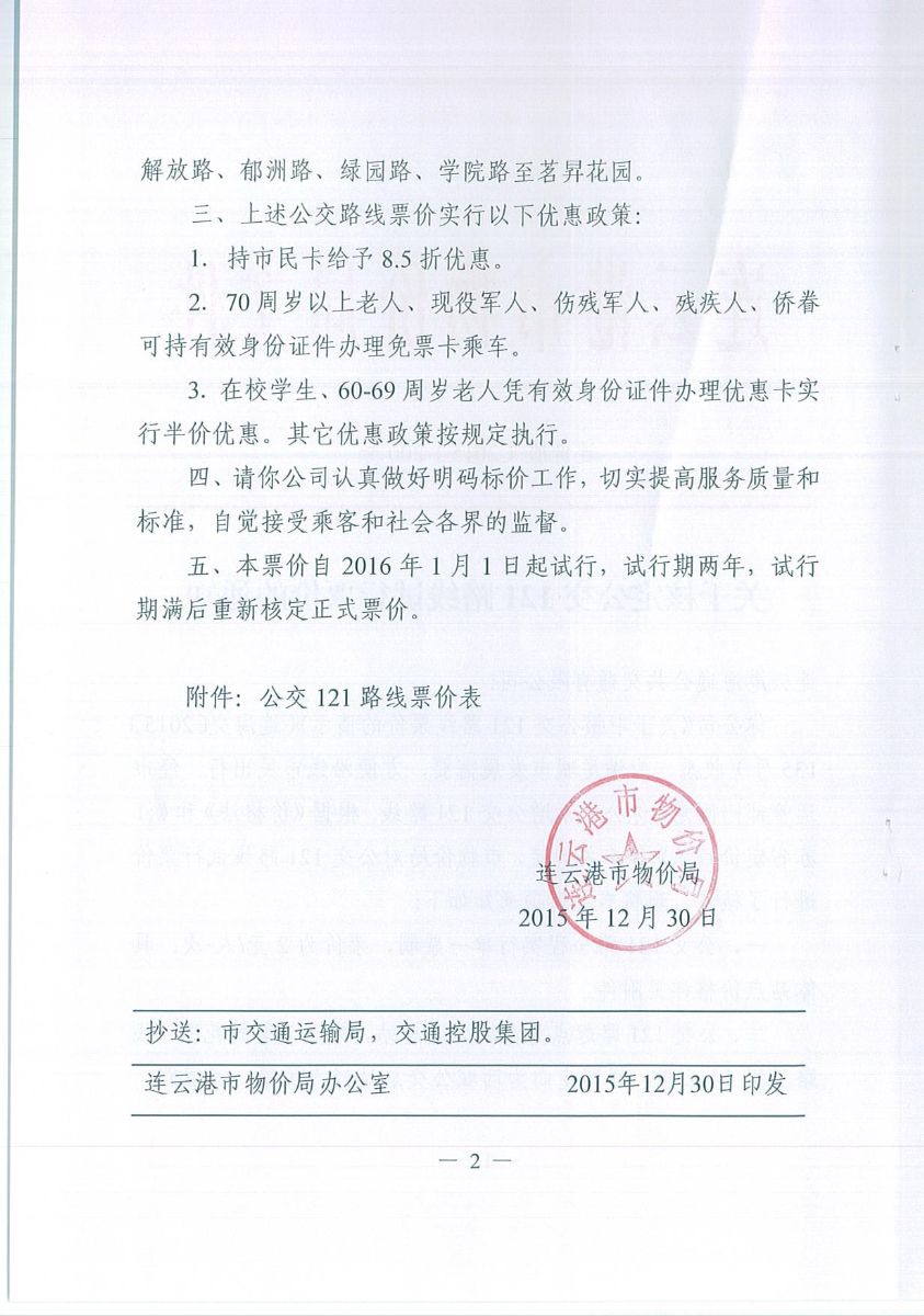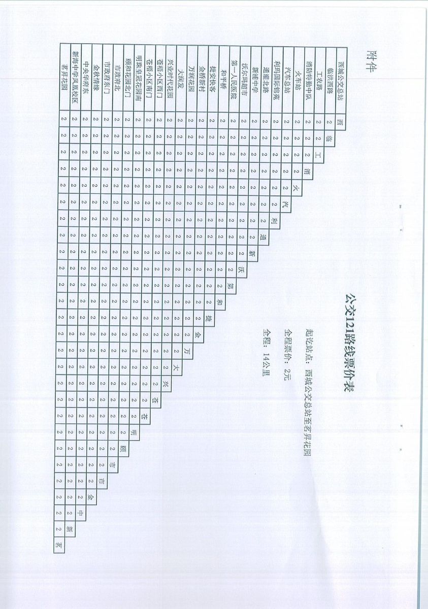 關(guān)于核定公交121路線試行票價的通知