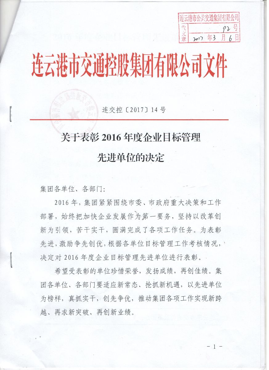 公交集團榮獲2016年度交控集團企業目標管理暨黨建、宣傳工作三項一等獎