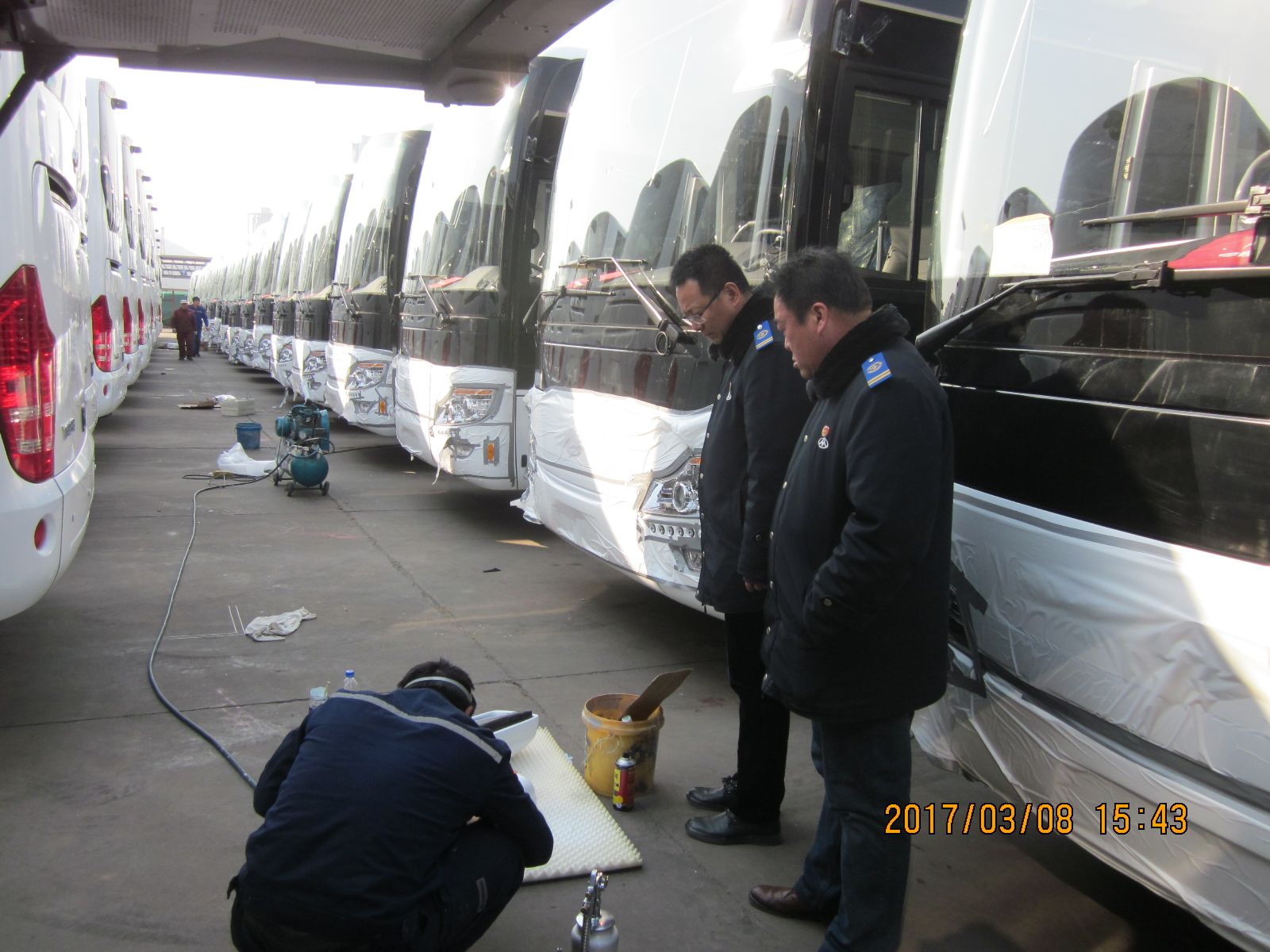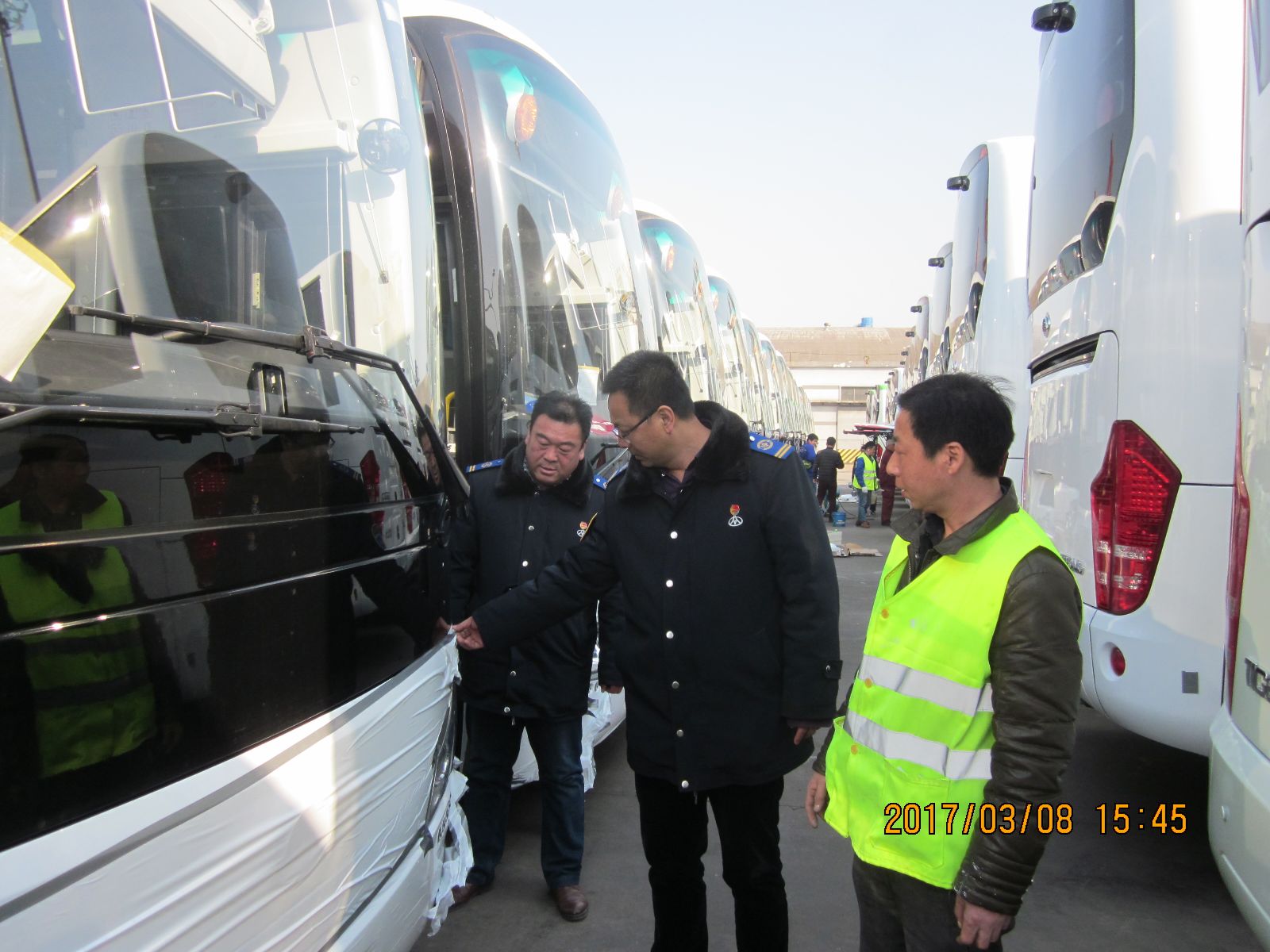 接到任務(wù)大家都感到壓力很大,因?yàn)楣恍蘩砉尽⒋笃謴S以往一天的工作量只能完成40臺(tái)左右高檔巴士整備工作,而現(xiàn)在任務(wù)是70臺(tái)一天,于是公司領(lǐng)導(dǎo)班子立即召開(kāi)專(zhuān)題會(huì)議,高度重視該批車(chē)輛出口任務(wù),精心布置抽調(diào)熟悉業(yè)務(wù)的精兵強(qiáng)將20人組成突擊隊(duì)。3月8日早上5點(diǎn)鐘,一行20人的突擊隊(duì)準(zhǔn)時(shí)出發(fā)奔赴港口,中午,打來(lái)快餐在工地現(xiàn)場(chǎng)就餐,放棄午休,連班作業(yè),下午趙玉軍經(jīng)理、楊國(guó)軍書(shū)記又親臨作業(yè)現(xiàn)場(chǎng)為大家鼓勁,并作安全作業(yè)交代,在大家的共同努力下直到晚上11點(diǎn)多鐘終于完成了70臺(tái)高檔車(chē)裝船前的整備工作,此項(xiàng)任務(wù)的如期完成也受到了外商及宇通客車(chē)廠家的高度評(píng)價(jià)。