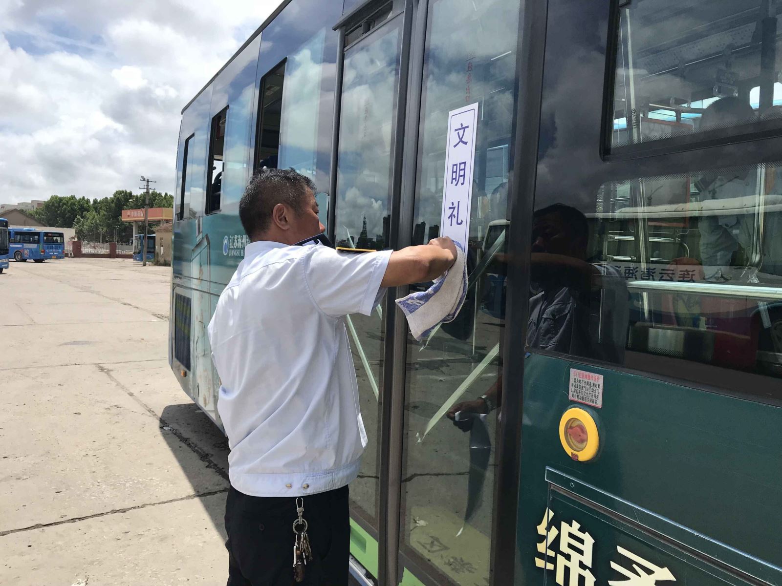 參加人員不怕炎熱,頂著烈日為496臺公交車統一張貼了嶄新的創建文明城市宣傳標語。一張張創文標語整齊的張貼在車輛指定位置,文明之風吹拂心田。此次張貼內容包括“社會主義核心價值觀”、“禁煙標識”、“公交線路走向圖”、“文明禮讓,先下后上”、“為老弱病殘孕讓座”等。