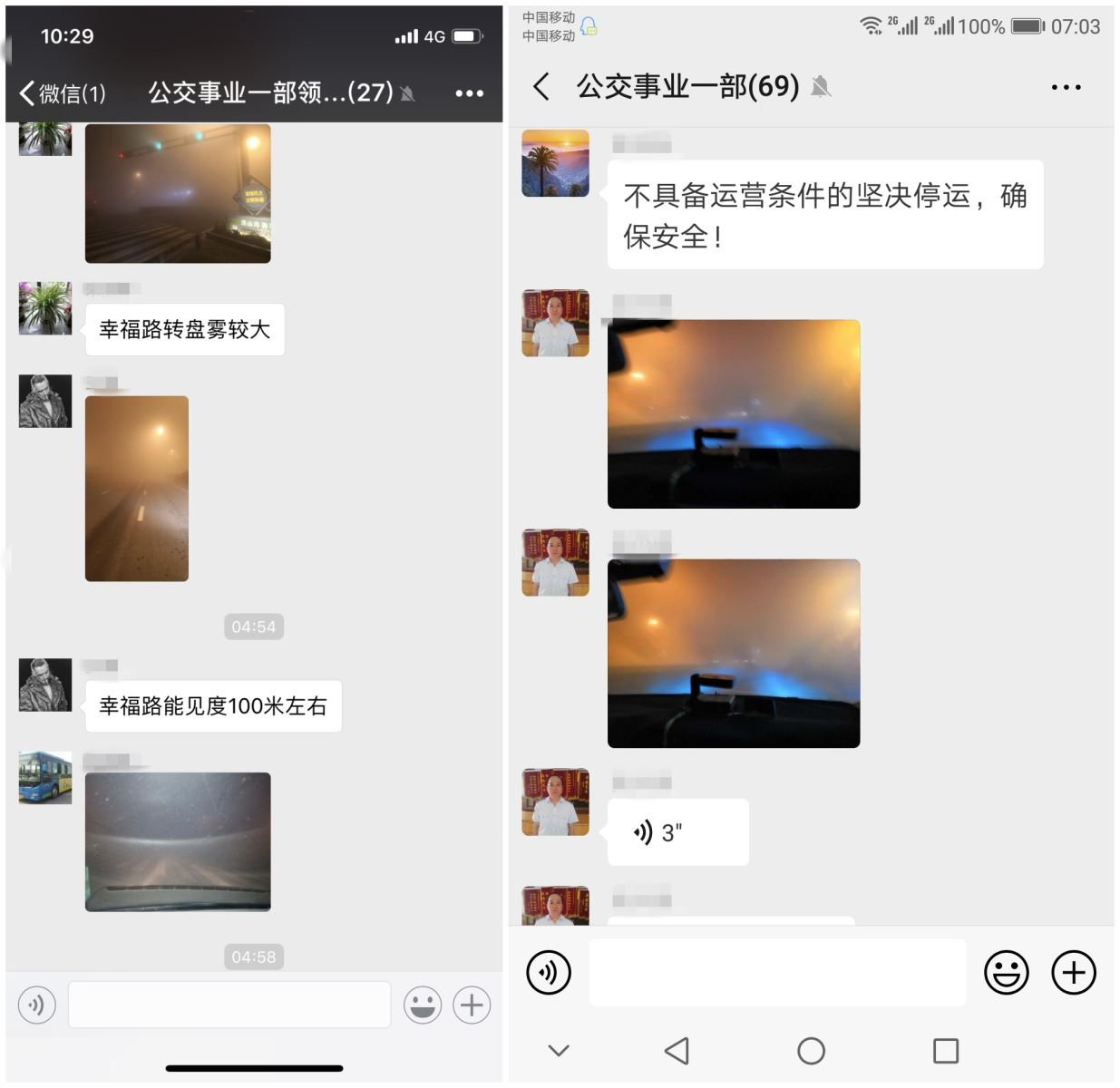 1月13日晚大霧包圍港城,當(dāng)晚19時(shí)左右,公交集團(tuán)各事業(yè)部微信群里發(fā)布大霧橙色預(yù)警信息,為確保冬季惡劣天氣行車安全,公交集團(tuán)立即啟動惡劣天氣應(yīng)急保障預(yù)案。根據(jù)保障預(yù)案有條不紊的開展工作,利用微信、QQ及現(xiàn)場管理等形式及時(shí)共享路況大霧信息,全體安管人員加強(qiáng)路況巡視力度,做好安全行車教育工作,特別加強(qiáng)對城鄉(xiāng)線路的現(xiàn)場管理工作,確保車輛在線安全運(yùn)營。
