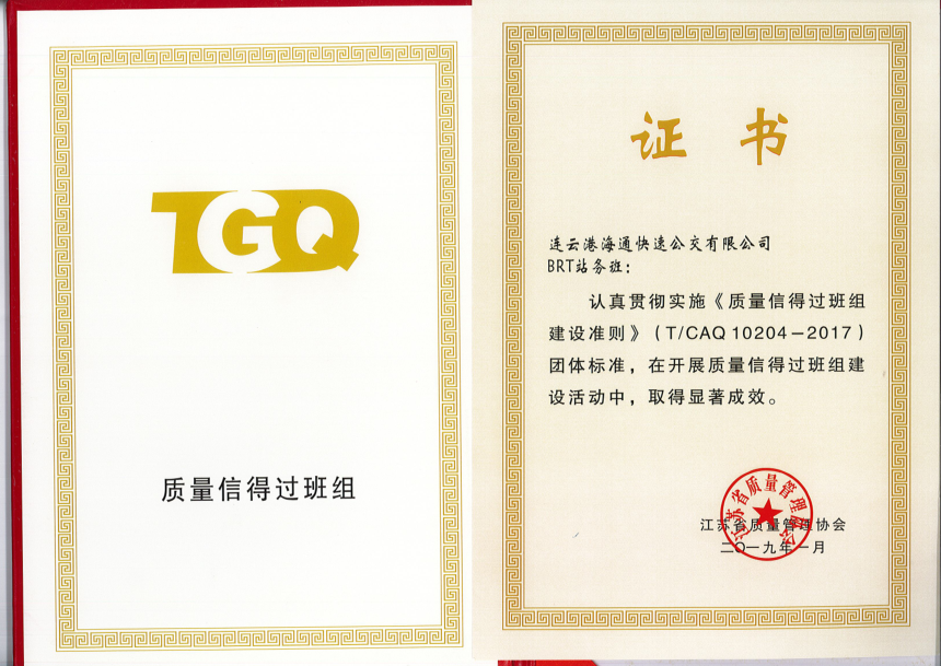 公交集團快速公交事業部喜獲“連云港市質量信得過班組”榮譽稱號